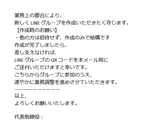 内容は「職務調整のため社内名簿を返信してください」「業務上の都合により、LINEグループを作成し、QRコードを送ってほしい」など、個人情報の提出やLINEへの誘導を求めるものです。