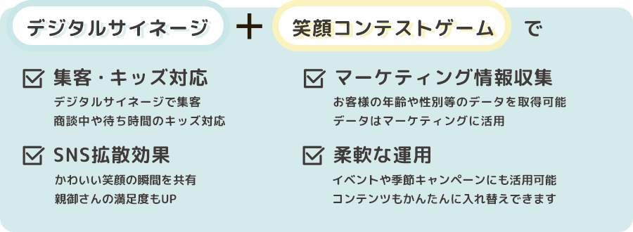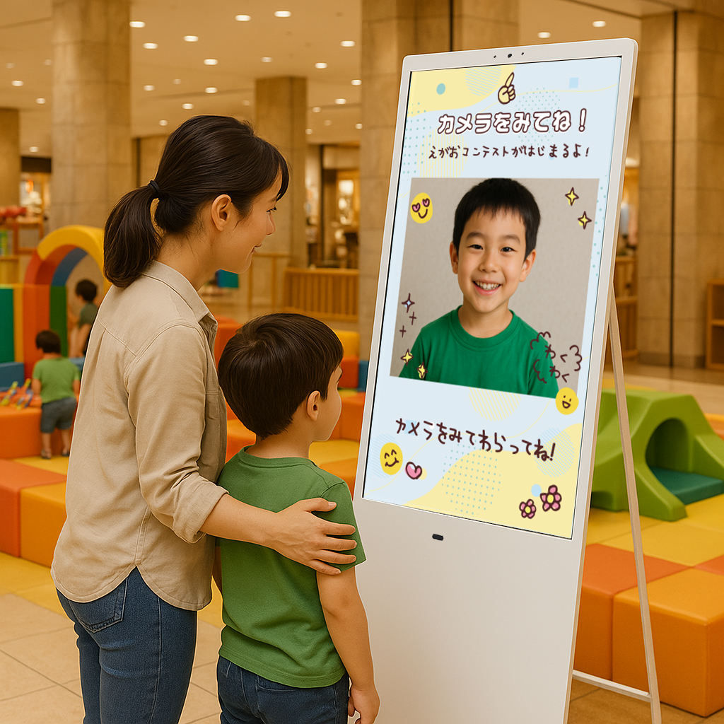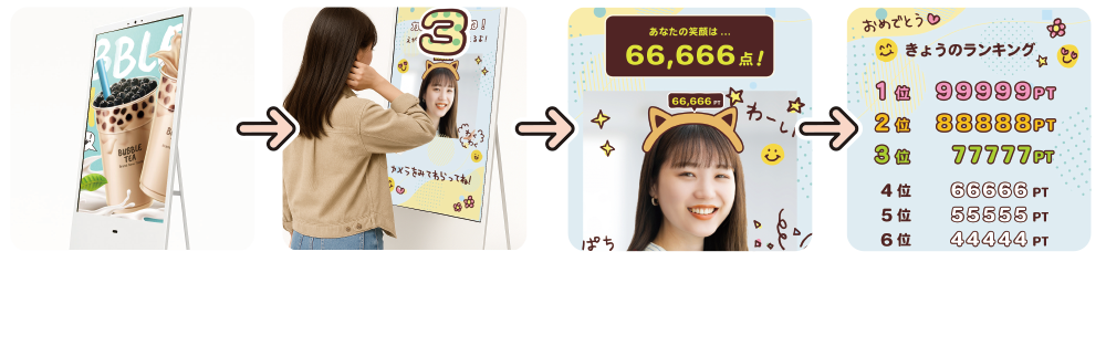 通常のサイネージの機能に加え、笑顔を採点するゲームでお客様に遊んでいただけます。